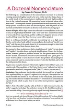 Title: A Dozenal Nomenclature Author: Dr. Owen B. Clayton Year: 11B5z (2009d) Subject: Dr. Clayton briefly outlines his approach on how to name and symbolize dozenal numbers. |