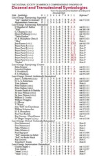 Title: The DSA’s Comprehensive Synopsis of Dozenal and Transdecimal Symbologies Author: Michael deVlieger Year: 11B7z (2011d) Subject: A poster-sized synopsis of proposals for dozenal symbologies. This 11" × 17" landscape-format poster summarizes numerals devised for dozenal, hexadecimal, and other bases. This brings together all symbols surveyed in The Duodecimal Bulletin issues Whole Number 99z (117d) and Whole Number 9Az (118d), as well as those submitted by readers and gleaned subsequently on the Internet. |