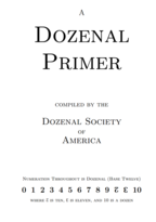 Title: A Dozenal Primer Author: Donald P. Goodman III Year: 1200z (2016d) Subject: A brief explanation of the dozenal system designed for beginners, in only a dozen pages. This little book is designed as a quick and easy introduction to dozenal for those who have no interest or knowledge of them. Weighing in at only a dozen pages, it is an ideal way to display the advantages of dozenal without overwhelming the non-mathematically-inclined. Available for sale at Lulu. |