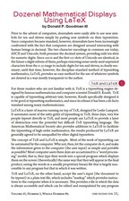 Title: Dozenal Mathematical Displays Using LaTeX Author: Donald P. Goodman III Year: 11B6z (2010d) Subject: A brief description of the LaTeX package "dozenal". A description of Mr. Goodman’s duodecimal extension of the LaTeX markup system, a layer of macros designed by L. Lamport which runs atop the TeX typesetting engine designed by Donald E. Knuth. |
