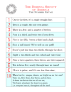 Title: The Number Rhyme Author: Donald P. Goodman III Year: 11B9z (2013d) Subject: A simple rhyme teaching counting and the basic characteristics of number one to a dozen. A simple rhyme describing the basic characteristics of the numbers 1–10z (one through a dozen), intended to be useful for students, particularly young children. More advanced that the traditional “One, two, buckle my shoe,” but designed to be a similar way to teach counting, though this rhyme at the same time teaches something about the numbers themselves. |