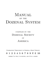 Title: Manual of the Dozenal System (Revised) Author: Donald P. Goodman III Year: 1200z (2016d) Subject: A short but thorough introduction to dozenals for those really interested in learning and using them. Clocking in at four dozen pages, this work is the updated version of the original Manual of the Dozen System published in 1174z (1960d). Fully updated for the digital world, this document is a great handbook for those wishing to learn and really use dozens. Available for sale at Lulu.