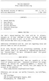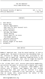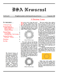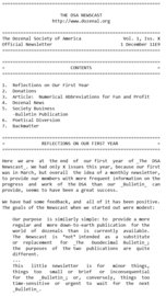Title: The DSA Newscast, Vol. 1, Iss. Az Date: 1 December 11B9z (2013d) Editor: Donald Goodman III Featured article: “Reflections on Our First Year”, “Numerical Abbreviations for Fun and Profit”; links; Poetical Diversion: “Ode of a Young Decimalist on Discovering the Dozen.” |