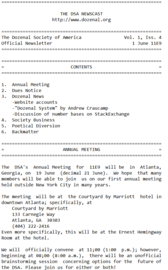 Title: The DSA Newscast, Vol. 7 Iss. 3 Date: 5 November 1203z (2019d) Editor: Donald Goodman III Featured article: “Annual Meeting, 1203z (2019d)”; Unicode and Dozens; Building an American Flag in Dozenal; Poetical Diversion: “Who has Need of Five?” |
