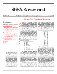 Title: The DSA Newscast, Vol. 3, Iss. 8 Date: 2 August 11BBz (2015d) Editor: Donald Goodman III Featured article: “Other Non-Positional Notation”; publication of Practical Polygons; links; Poetical Diversion: “An Ode to Three”. |