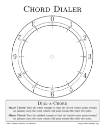 A simple, printable chord-dialer, which uses the innate powers of the dozen to identify harmonious major and minor chords. Notes are identified both by dozenal numbers and by the traditional musical notation (C, D, etc.). |