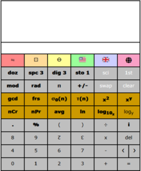 A fine, visual calculator which works in both dozenal and decimal. Using “A” for ten and “B” for eleven, this calculator includes the basic trigonometric and logarithmic functions, some rudimentary memory functions, and of course the basic functions. It further includes exponential notation and buttons for certain constants (like π). Finally, it allows angular functions to be done using the traditional degree system (260z = 360d) degrees to the circle); the radian system; the circle divided into one dozen parts; or the TGM unciaPi system (the semicircle divided into a dozen parts). Designed to run in Windows, it also runs quite nicely under Unix-like systems using wine. You can also download it with its C++ source. |