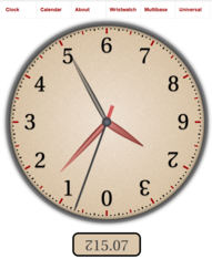 Title: Online Dozenal Clock Author: Paul Rapoport Type: Utility Nature: Web Summary: Very attractive online dozenal clock implemented in Javascript, done in a painterly style. |